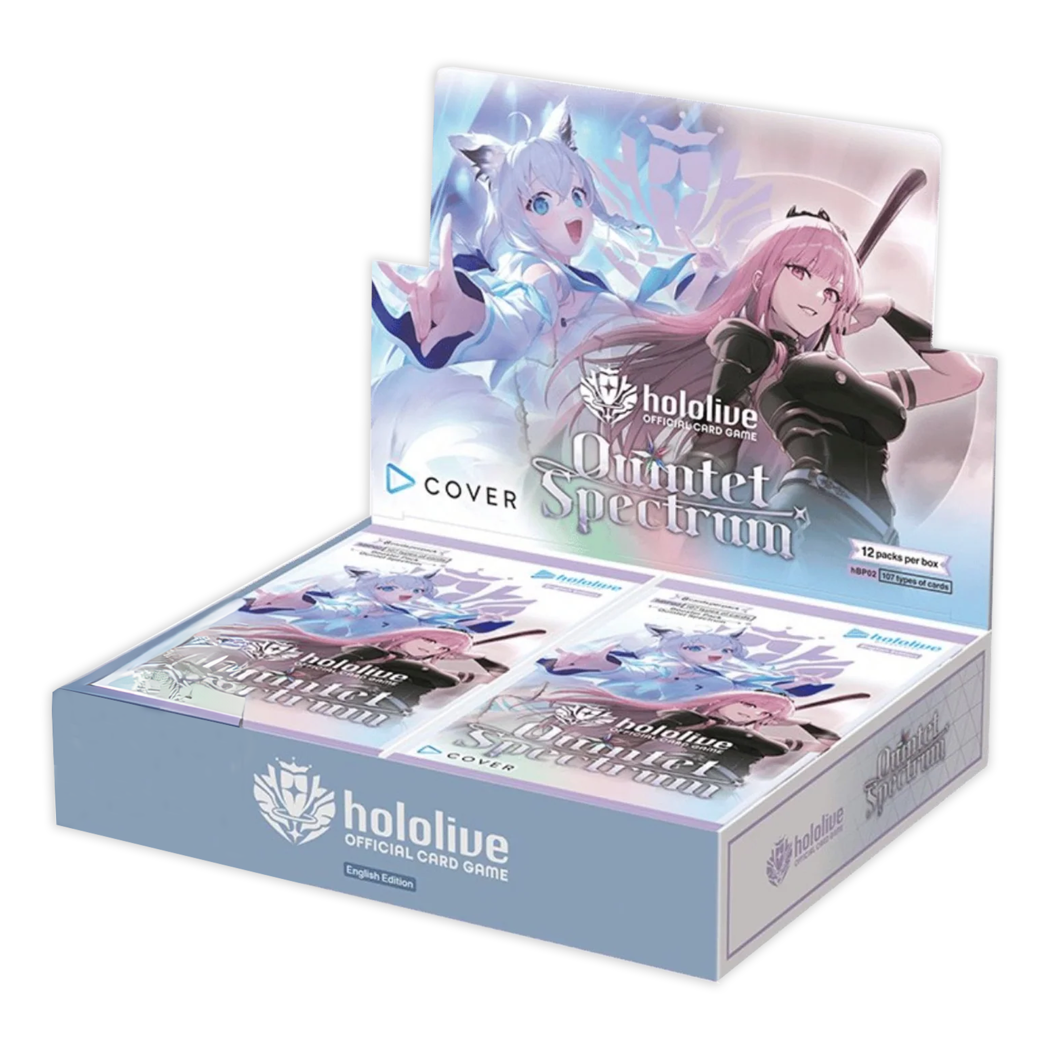 The Hololive universe shines brighter than ever in the Hololive Official Card Game: Quintet Spectrum (English Edition)! This spectacular new booster set debuts the Purple attribute, expanding deck-building possibilities and connecting Hololive’s most beloved generations. Featuring stunning artwork, new mechanics, and premium chase foils, Quintet Spectrum celebrates the full colour and energy of Hololive’s idols — from Shirakami Fubuki and Houshou Marine to Sakamata Chloe and Inugami Korone.