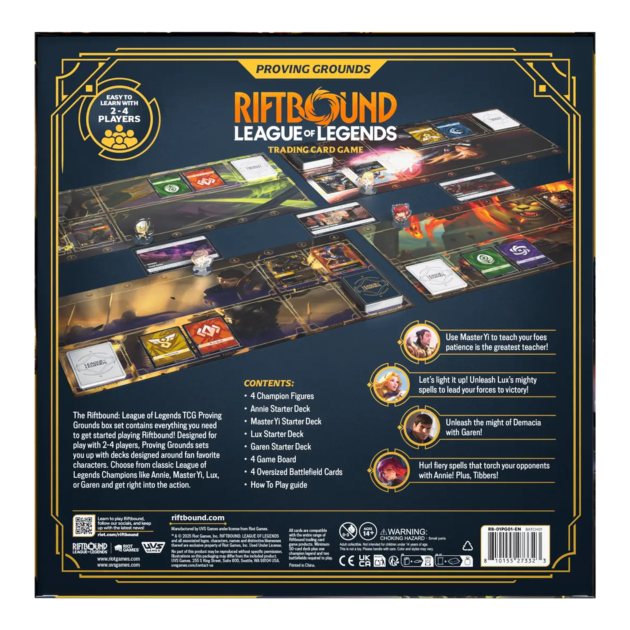 The Riftbound: League of Legends TCG – Origins: Proving Grounds Box Set is your gateway into the world of Runeterra battles. Built for 2-4 players, this all-in-one set gives you pre-built decks, champion figures, and everything you need to start playing and collecting right away.
